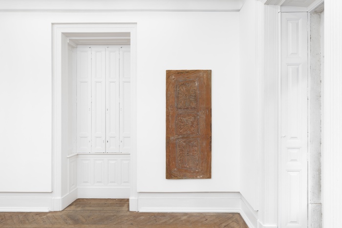 In 1976, as she followed along this path Bucher began her first projects using latex to mould architectural elements and build drapery-like fluid versions of latex moulded on architectural spaces. For the first of these projects, she moulded the door of her Zurich studio and called it “Borg” (Die Türe zum Borg, 1976) [Borg (Door to the Borg) 1976]; the symbolic access to a protected space of retreat.