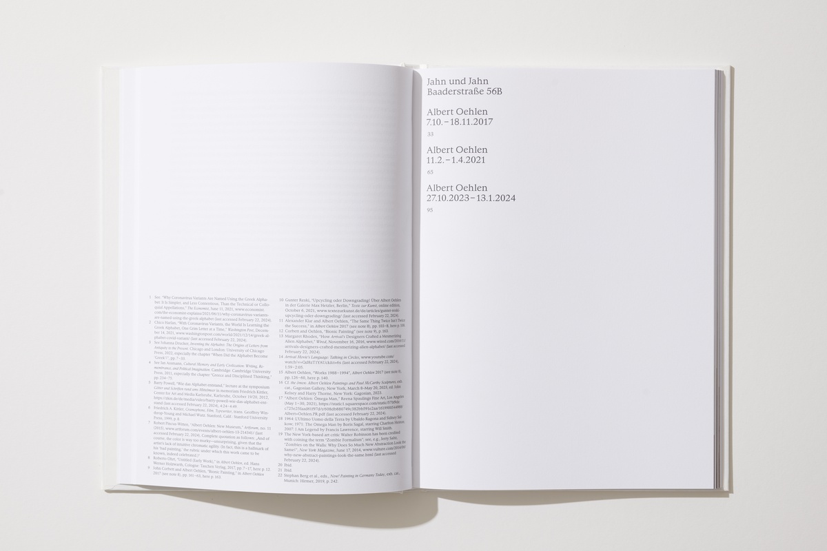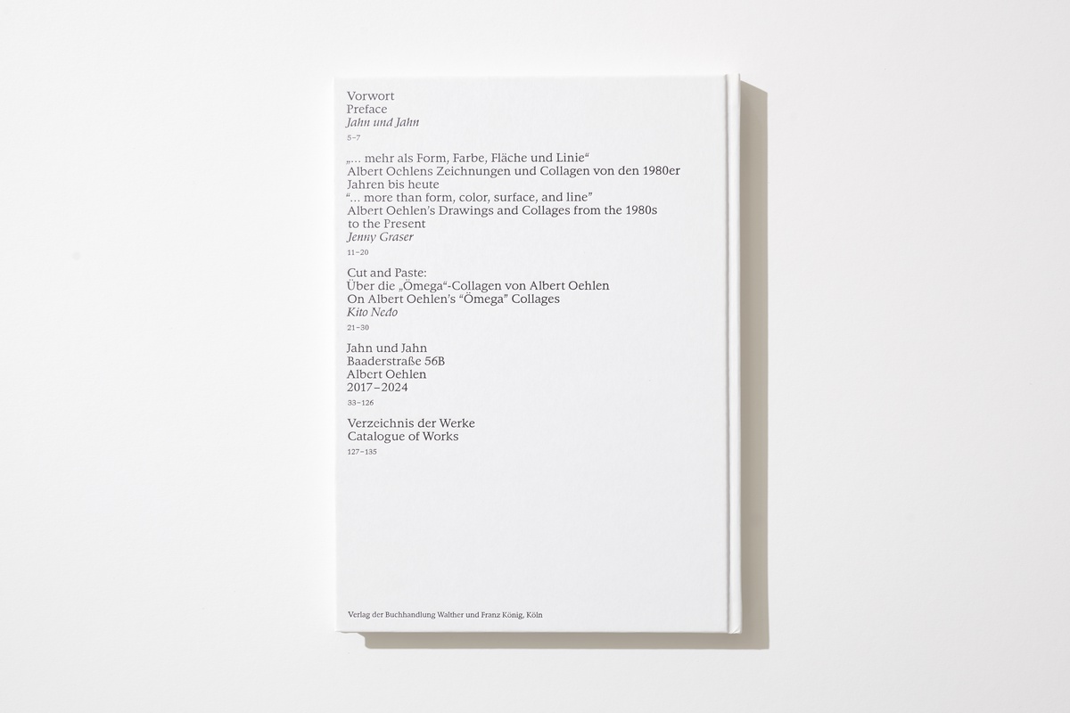 Mit Texten von Jenny Graser, Kito Nedo. Deutsch/Englisch, 136 Seiten, 20 × 28 cm, Hardcover © 2025 Albert Oehlen, die AutorInnen, Jahn und Jahn München/Lissabon und Verlag der Buchhandlung Walther und Franz König, Köln © VG Bild-Kunst, Bonn 2025 Übersetzung: Gerrit Jackson Design: JMMP – Julian Mader, Max Prediger, Hamburg