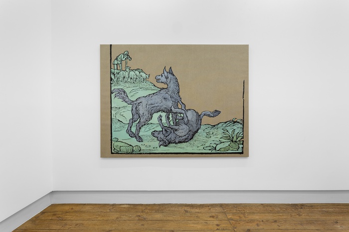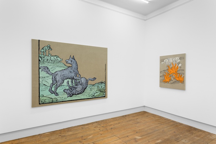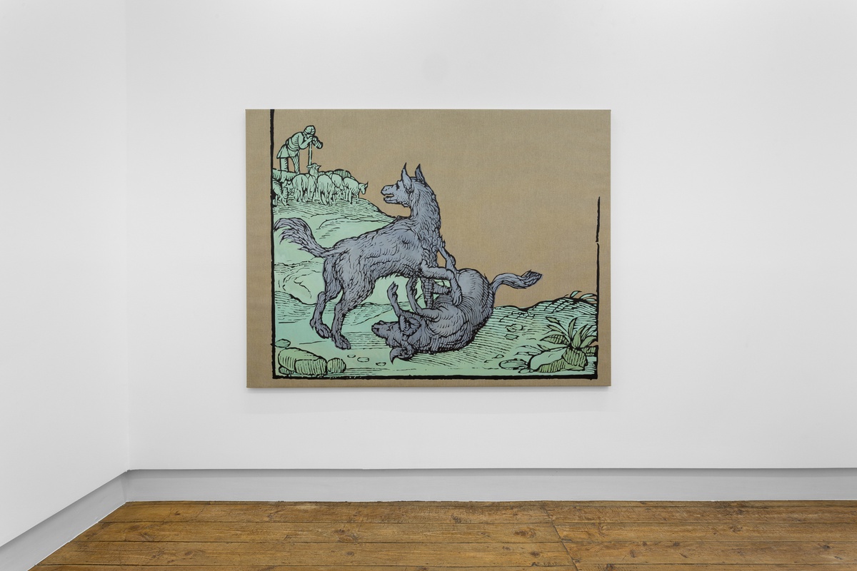 There is an anachronistic quality to the work, the paintings layer medieval iconography with a strong contemporary visual language. This is a dialogue that is underpinned by Frutuoso’s deep knowledge of his materials and techniques. Frutuoso evokes a time when imagery operated as a way of building and disseminating knowledge and as such, the artist brings the didactic quality of medieval fables and allegories into question. Utilising his contemporary visual perspective, Frutuoso subverts the notion of the image as an oracle and in doing so, the work speaks to us about our existence – a human or non- human lived experience – full of tensions and disclosures. These tensions are conjured through different visual components: wolves, fire, blindness; longstanding symbols that have accompanied myriad cultures with both subjective and collective meaning.