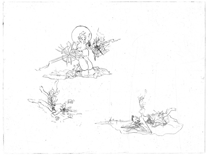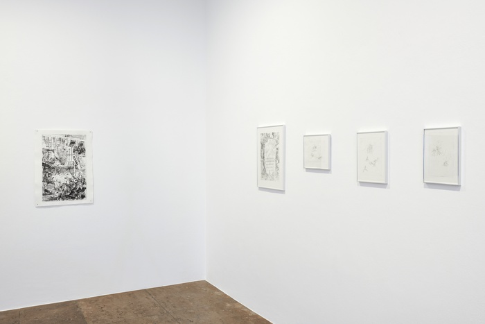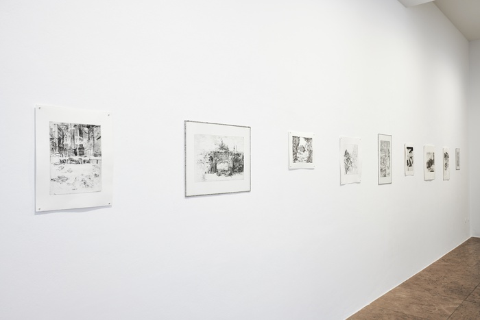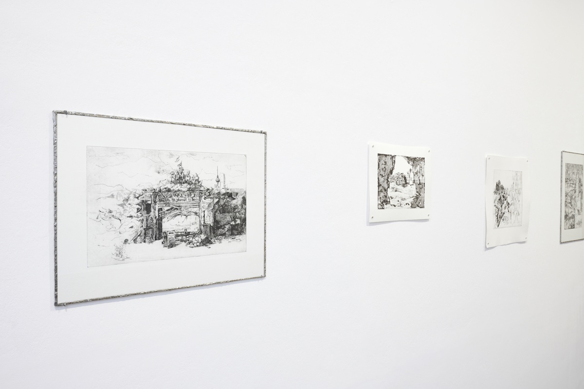 Since the romantic era, we have associated images of ruins with a retrospective longing. From the second half of the 18th century, fantastical ruins made constructors dream of the pre-industrial middle ages. In contrast to pristine replicas, their decidedly ruinous nature was intended to make the past tangible and thus root them in a history that had never existed in this painterly form. Jung’s etchings resist such a romanticized interpretation. In her case, it is not just buildings that are overgrown and seem to gradually dissolve; any realism in her images, produced by lines, disintegrates eventually. The apparent romantic idealism is counteracted by the occasionally aggressive internal dynamic of her line work, which calls to mind the abstraction movement of the 20th century and the attempt to free itself of any historical references or content. As such, the images defend themselves against interpretations that would too quickly reduce them to either motif or concept. The fact that Jung encourages the graphic “self-defence” of her images through digital glitches and gridded areas, as used in Manga, shifts the old artistic conflict between the primacy of content and the autonomy of form into the present, from where a fleeting glance at traditional etching techniques might still be possible.