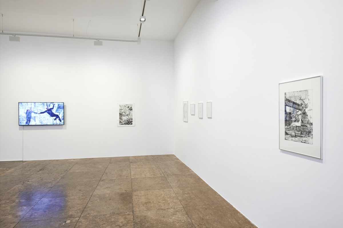The film "Aufstand der Lageristen (Uprising of the Warehouse Workers)" (2021) is not really a film, but rather an image in which the branching paths of Jung’s etchings literally start to move. While the eye of the camera pans slowly over image landscapes where factory buildings, warehouses and package centers are suggested and overlaid, men and women in the foreground hover in blue work uniforms. These are the warehouse workers referred to in the title. Their uprising, however, is more like a quiet dance between patches of digital fog, calling to mind notions of resurrection and ascension to heaven rather than earthly rebellion. But we are urged to see the precariousness of workers who, driven by rapid developments during the corona pandemic, pack and organize boxes of impersonal products, monitor rolling robots and impellers and carry out deliveries. Sometimes we encounter them in fleeting moments in front of our own doors. But the radical quality of the title, the uprising, makes Jung’s composition a catalyst for thought: are the warehouse workers already rising above things or are they entangled in a veil of conditions that make them invisible?