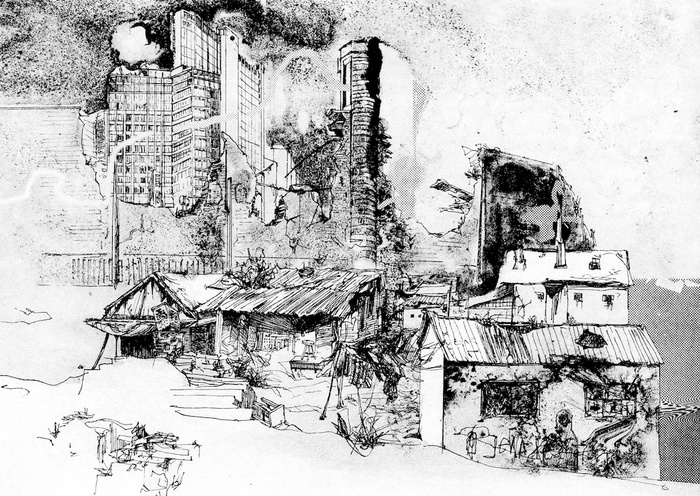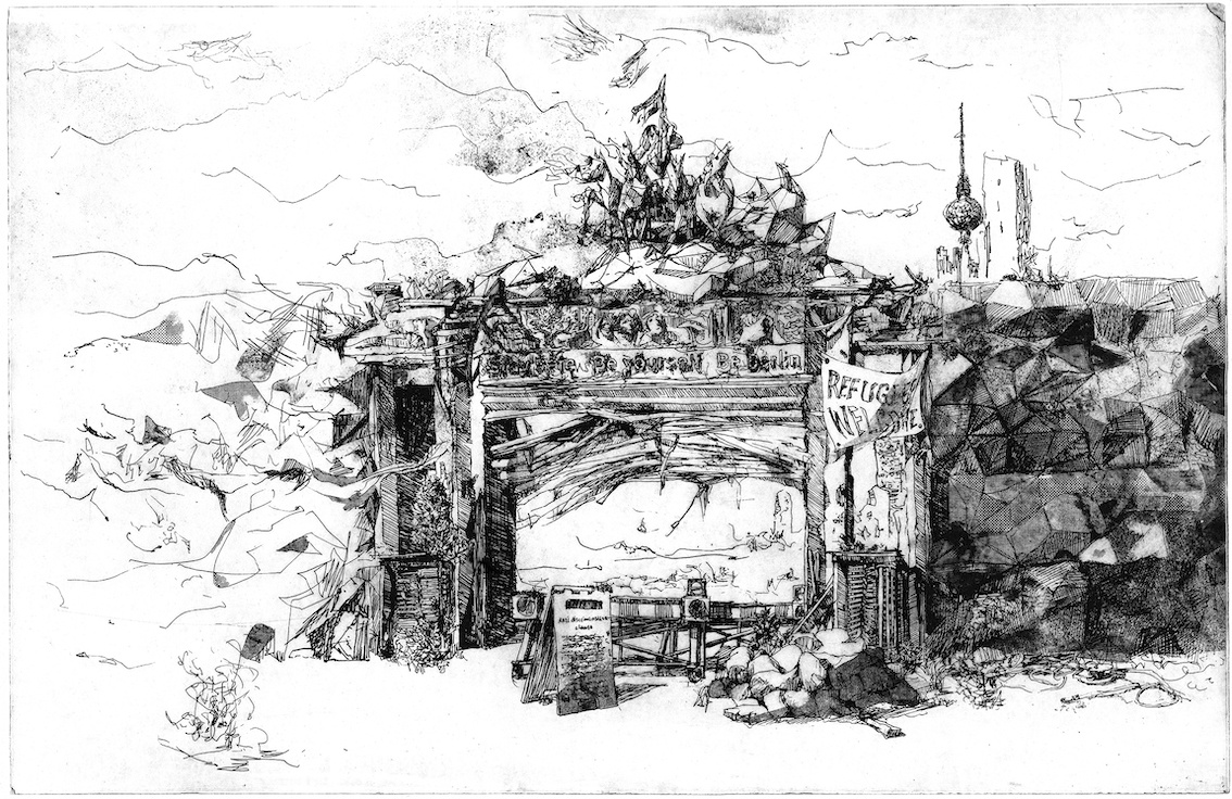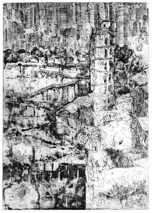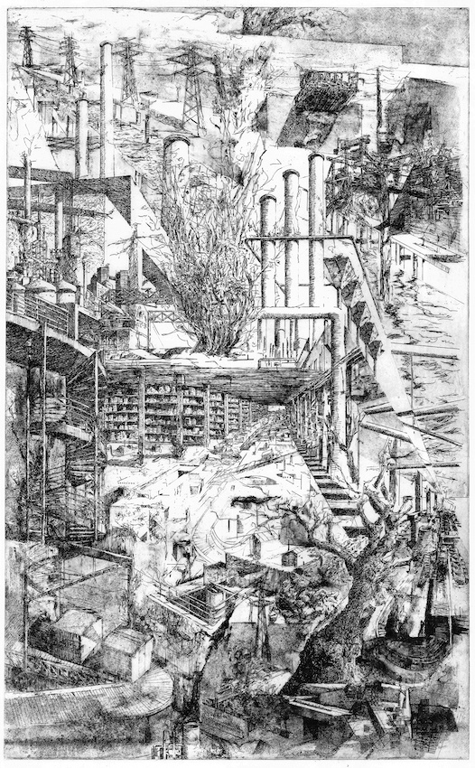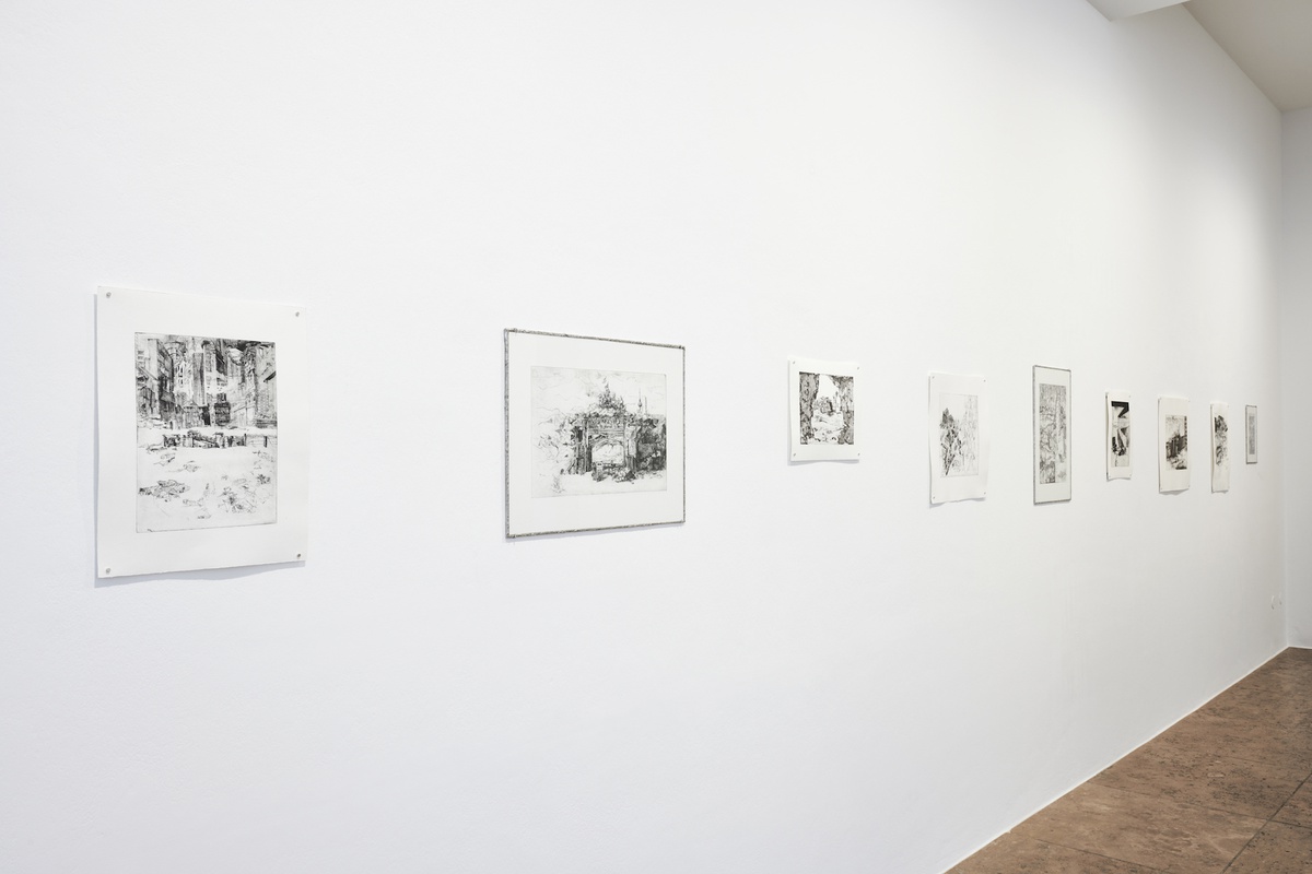 At one time, the function of city walls was to defend against external attackers, but also to protect the internal social order through the rigid expulsion of the sick, criminals, or people from foreign cultures. What would it mean if growing cities of the global present resorted to these kinds of bulwarks in a potentially post-national future? And what would it mean in this context if the slogan “starve and demoralize” gained traction? This was once declared the intention of the organized sieges of cities by foreign armies. But it will more likely be armies of the poor who will besiege our unaffordable cities in the future. Or could it be turned around: is it poor in the slums of the world that have been starved and demoralized next to luxurious gated communities? Jung limits herself to hinting in her etchings and also blurs meaning through the occasional use of the past tense: for her, cities and future bulwarks have already fallen; the scenes are empty of people. Are her envisioned futures utopian or dystopian? In these images, too, what triumphs in the end is the autonomy of the line – the rest is just a series of possible things that have been.