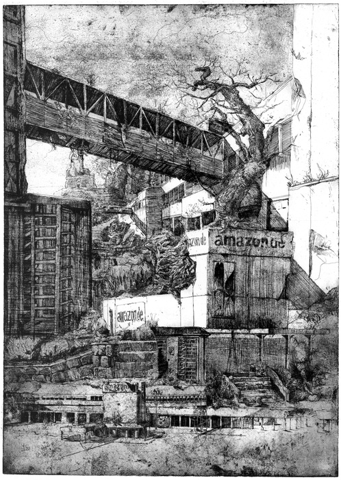 Ideal worlds can be thought forwards and backwards. There are forward-facing utopias, and there is such a thing as retrotopias, idealizations of the past as strongholds of “the good old days.” Soyon Jung’s images lead us in both directions. They are premonitions of the future – told in the past tense of ruined landscapes. For her etching series "Futur II (Future II)" (2019/2020), this mode inspired the title. But does this series really deal with ideal worlds? Numerous headquarters of “major powers” in society – among them the investment company Black Rock, the Facebook Group, the Springer Verlag, and the CSU – are left to the ravages of time. Jung’s etchings reduce to ruins buildings that currently represent the stability and future consolidation of the power of their owners.